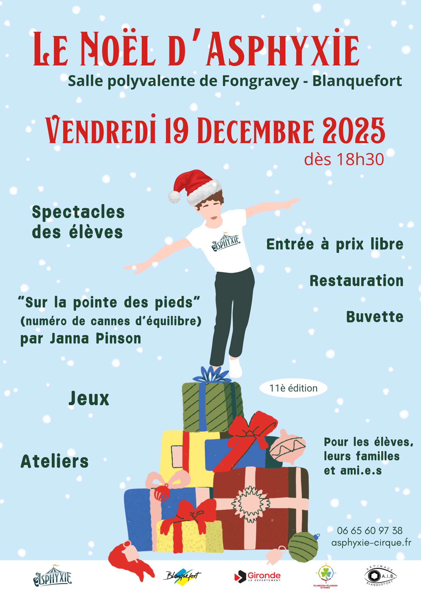 L’Association Asphyxie a le plaisir de fêter Noël le vendredi 19 décembre 2025 à la salle polyvalente Fongravey (26 Rue Jean Moulin, 33290 Blanquefort) à partir de 18h30. Cet événement interne à l’école de cirque est à prix libre, sera l’occasion pour les enfants et toute la famille de découvrir le cirque et les arts de la rue au travers d’un spectacle et de bien d’autres surprises.